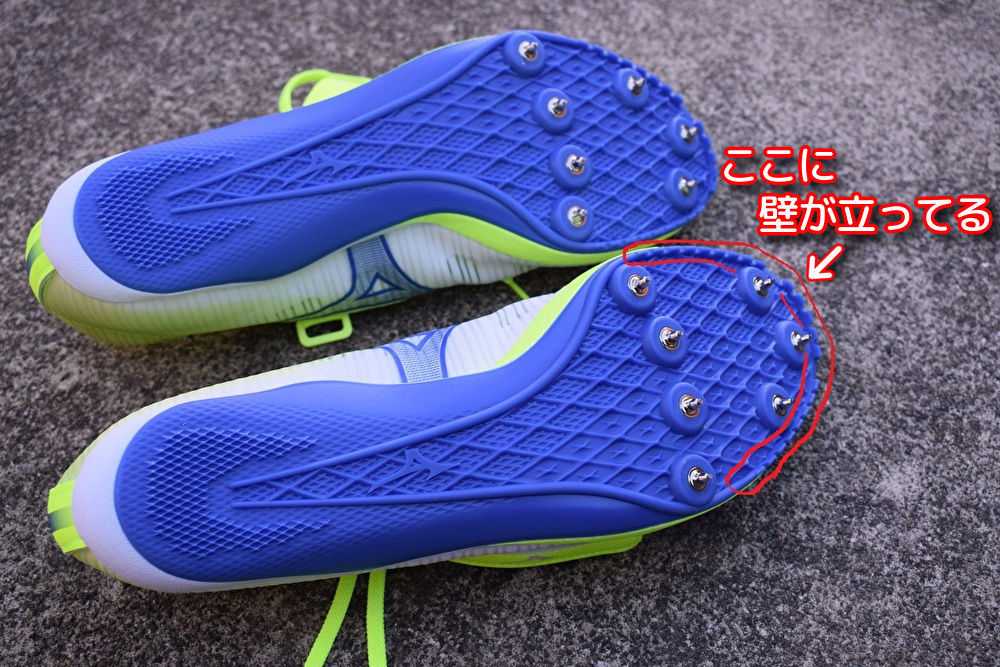 足裏を転がしてみると、後列ピンを超えるときに段ピンだけあって少しだけ押し返される感じがあって、ここを超えると前にコロンとなる感じがあります。アディダスにもこれと同じような『カクンとするライン』がもっと露骨にあるのですが、アディダスの場合はもっと構造的な出っ張りを感じます。ミズノスプリントではそれほど出っ張っている感じではなくて、後列ピンが疑似的に支え台のような役割を持っているのかもしれません。