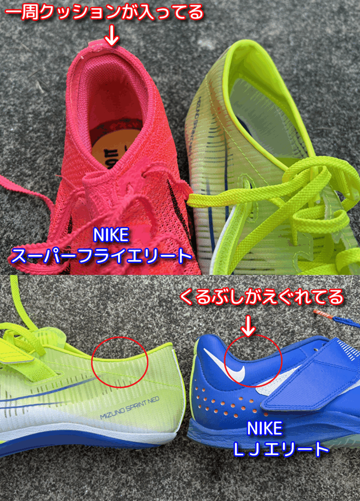 どちらも短距離・ハードルを対応種目としていますが、ネオは前足部が厚くなっていて、ネオが付かない方(無印と呼びましょう)は全面に厚みがあるという違いがあるようです。なんで分けているのかはよくわかりませんが、ネオはショートスプリント(100m200m)、無印はロングスプリント(400m)向けになっているのだろうと解釈しています。